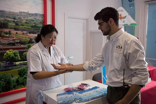 當薩仁在中國館尾廳進行綠色中醫(yī)針灸展示時,不時有好奇的游客上來體驗。一位在中國館交流的美國館志愿者也想親身體驗中醫(yī)針灸。短暫的號脈后,薩仁說:“這小伙子體格很好,就是手腳會在冬天發(fā)涼!闭f著便幫美國館志愿者進行舒解經(jīng)絡(luò)的治療。